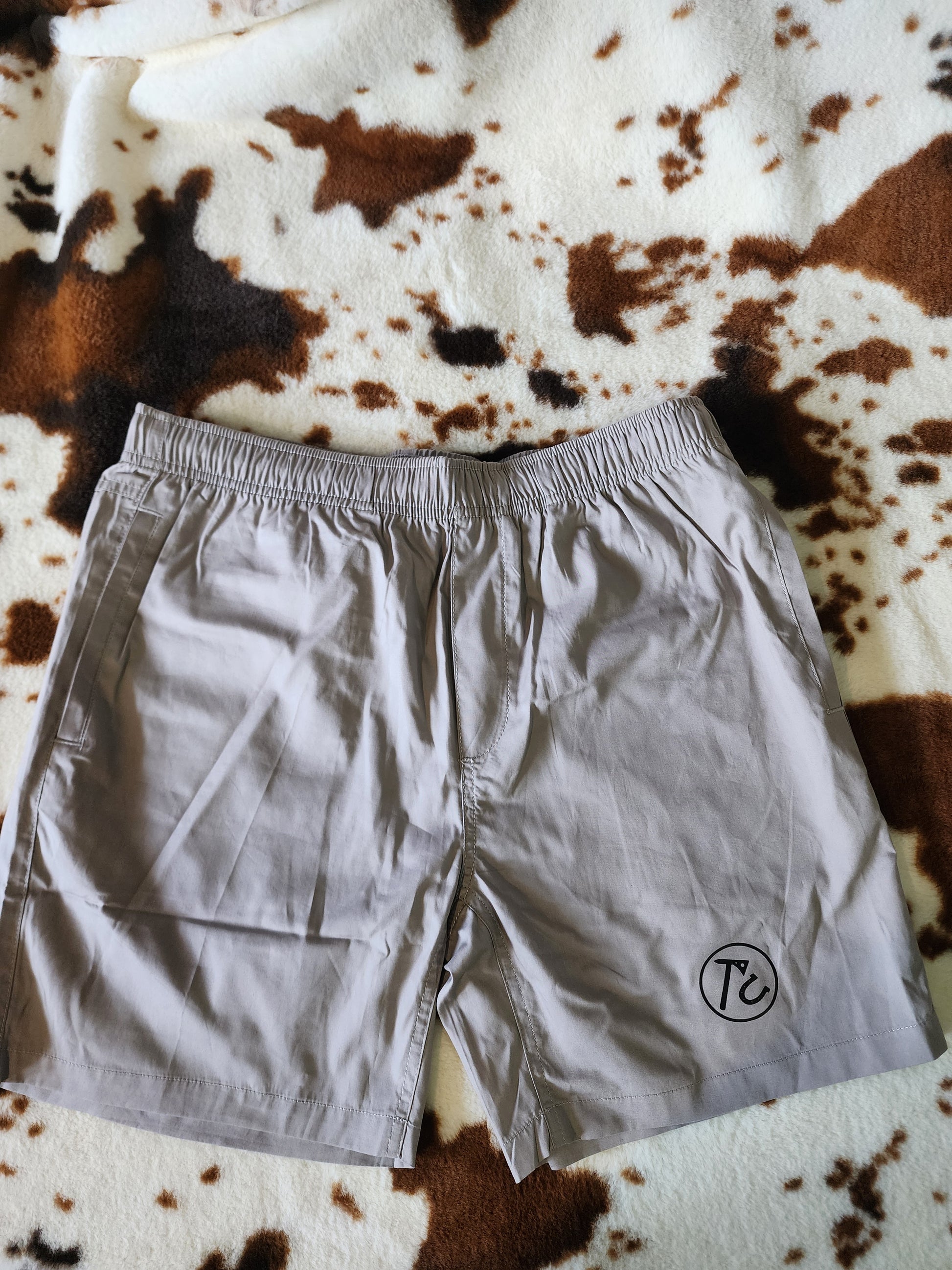 Tan with black TC logo shorts.